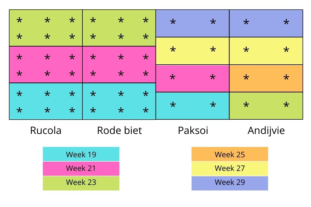 Ik begin dus met zes plekjes rucola en rode biet. Twee vlakjes paksoi en nog geen andijvie, daar is het simpelweg nog geen tijd voor. Over twee weken plant ik nog eens zes keer rucola en rode biet, en twee plantjes paksoi. Weer twee weken later herhaal ik dat, maar zonder de paksoi, want daarvoor is het dan te laat. Ik begin dan wel met de eerste twee plantjes andijvie, die ik ook weer elke twee weken netjes plant. In juli mag ik ook weer paksoi gaan planten dus dan ga ik dat ook weer doen. Zo blijven er de komende maanden telkens nieuwe plantjes in mijn bak staan en kan ik de oude leeg oogsten zonder de week erop niks meer te eten te hebben. Wat ik daar dan ga plaatsen bedenk ik als het zo ver is, want ik heb vorig jaar gemerkt dat ik vooruit denken in deze heel moeilijk vind. Wellicht kan ik spinazie gaan planten in de bak als de rucola eruit komt. En voor het najaar wil ik wintersla planten. Genoeg te bedenken dus, maar voor we de eerste oogst kunnen verwachten zijn we sowieso al 4 tot 10 weken verder, afhankelijk van de groente!