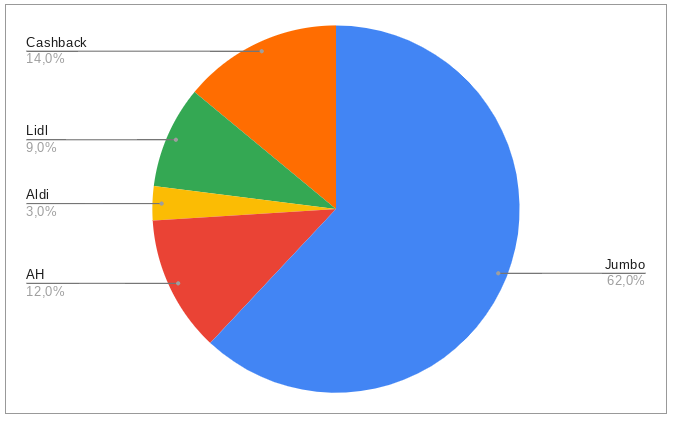 Deze maand heb ik € 189,00 uitgegeven aan boodschappen, dat komt neer op € 43,00 per week en is dus iets meer dan wat ik eigenlijk wilde uitgeven. Dat zal echter wel weer worden rechtgetrokken als ik in de zomer echt uit mijn tuin kan eten. Deze maand hebben wij maar drie keer uit de moestuin kunnen eten, eigenlijk vooral wat ik nog in de vriezer had liggen uit de moestuin. Meeste van mijn geld gaf ik uit bij Jumbo, maar ook Albert Heijn is veel bezocht. Aldi en Lidl