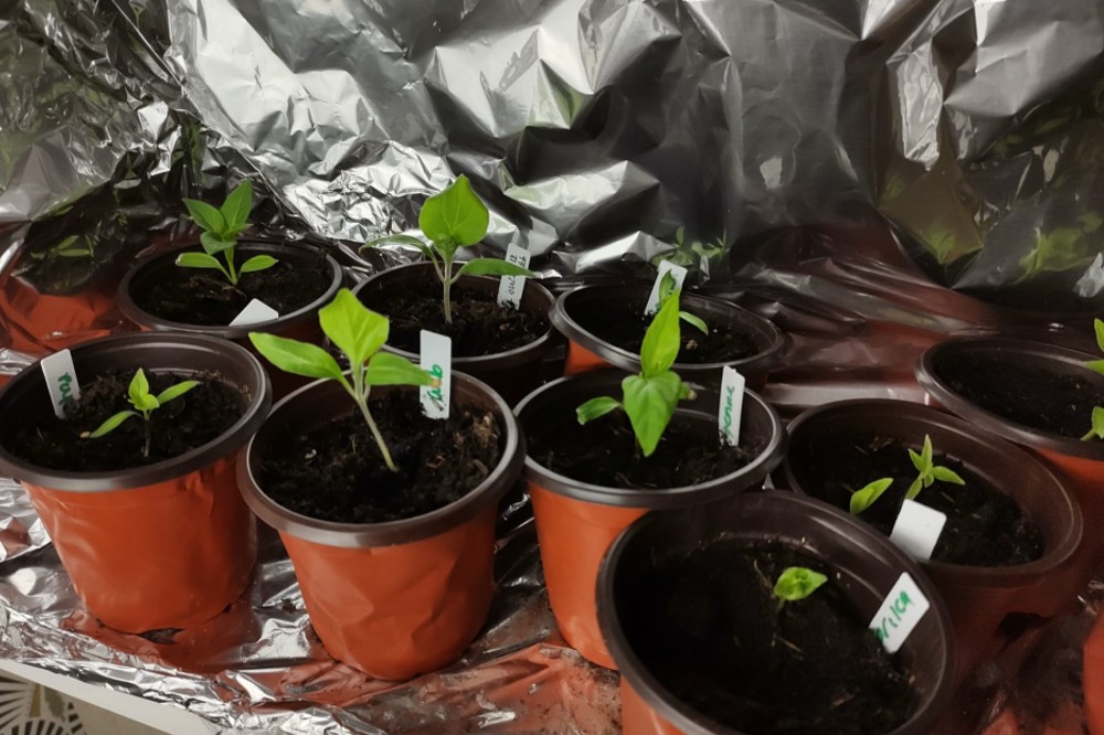 Inmiddels staat de woonkamer goed vol met alle zaailingen, sommige nog voor het raam, anderen onder de groeilampen in het kasje (zonder het plastic) wat ik voor mijn verjaardag kreeg. IJsheiligen is natuurlijk nog wel eventjes weg, dus dat zal nog wel eventjes zo blijven. Het mooie weer zorgt wel dat ik groenten die wel tegen een stootje kunnen al heb durven uitplanten. Maar tomaten en paprika moeten nog even binnen blijven. Zoals ik al zei heb ik in de woonkamer een stellage staan met groeilampen, maar voor mijn paprika heb ik een andere constructie bedacht. Want voor alle plantjes is beneden geen ruimte. Daarom heb ik een doos bekleed met aluminiumfolie, die voor het raam staat met de paprika’s, pepers en aubergines er in.