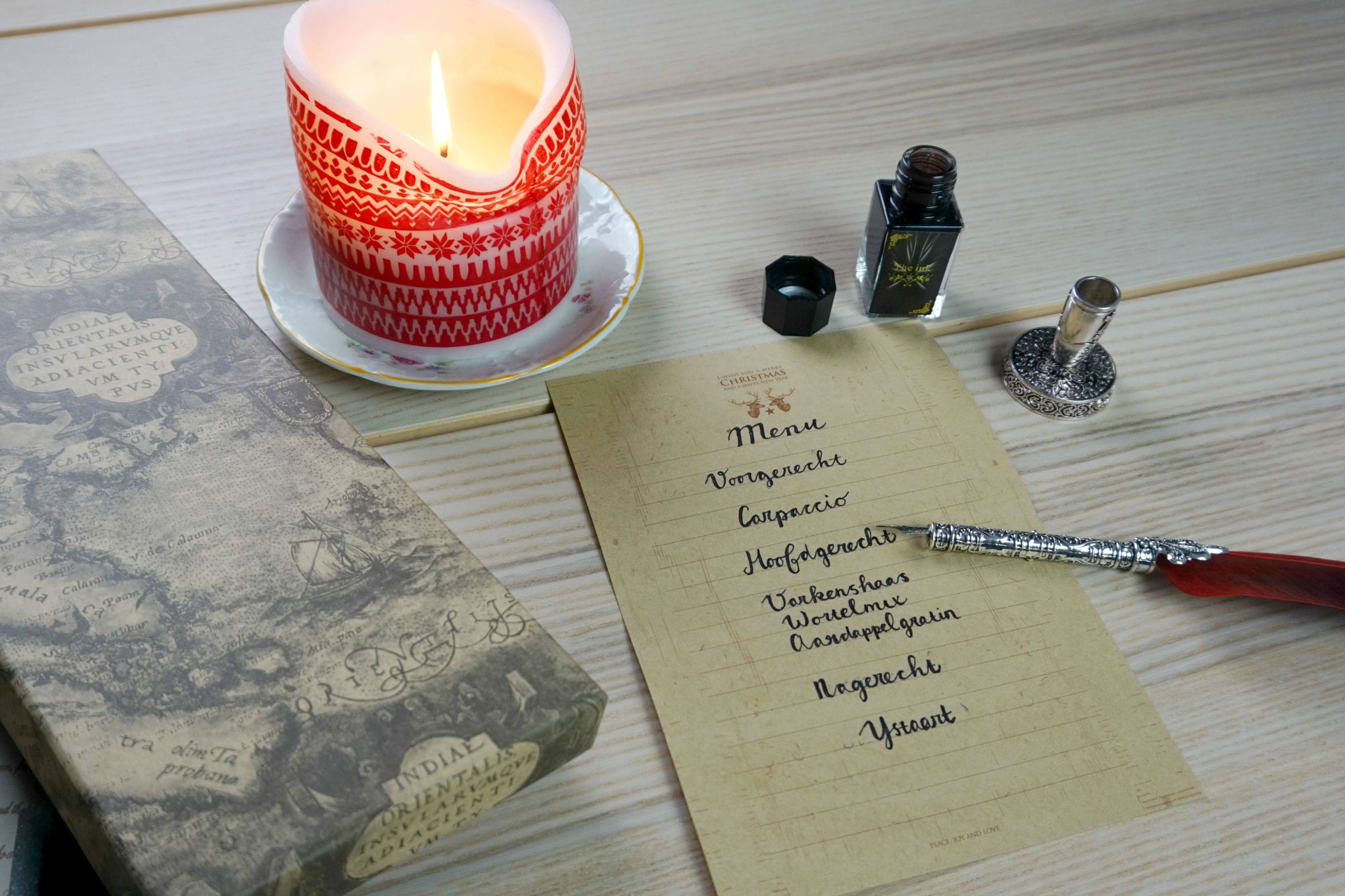 Ik ben dol op handlettering en doodling. Ik doe dat graag in mijn bullet journal, maar ook op kaarten. Ondanks dat ik er dus nog niet zo heel goed in ben. De leuke kalligrafeer-veer gebruikte ik dus om op het papier dat in het pakket zat mooie menukaartjes te schrijven. Dit is ons menu voor eerste kerstdag, als ik met mijn vriend alleen eet. De veer en de verpakking waar hij in zit doet me echt enorm aan Harry Potter denken, jou ook? Om de menukaartjes te kunnen neerzetten gebruikte ik simpelweg in stukjes geknipte en alufolie gewikkelde wcrolletjes. Verzwaard met een waxinelichtje, zodat alles niet omkukkeld. Ik vind het echt heel creatief en niet eens heel erg storend.