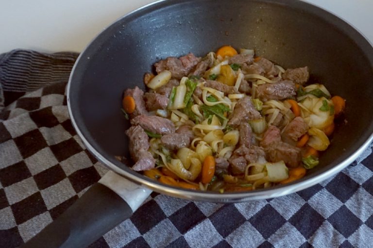 Stap 6 – Giet de udonnoedels af en voeg samen met de paksoi, ketjap en sojasaus toe aan de wok en roerbak dit nog zo’n 3 minuten. Voeg als laatste de biefstukreepjes nog toe, schep door en verdeel over 2 borden.