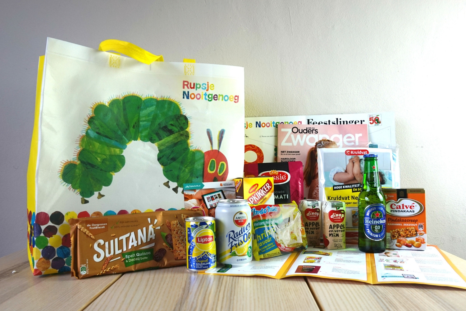 De Negenmaandenbeurs shopper is duidelijk minder goed gevuld dan de Huishoudbeurs shopper, maar de tas zelf is zoveel leuker! Was ik vorig jaar nog enorm enthousiast over de Dikkie Dik tas, misschien vind ik Rupsjenooitgenoeg nog wel leuker. Enige wat ik heel jammer vind is dat ik gewoon géén Woezel en Pip tas heb kunnen scoren, maar deze kreeg je bij de Etos als je luiers bestelde en dat leek me een beetje overdreven. Anyway, de vulling van de Negenmaandenbeurs tas is gelukkig wel vooral op mama en papa gericht. Ik denk dat mijn vriend de Sultana’s en pindakaasrepen erg zal kunnen waarderen, zelf ben ik weer vooral fan van alle drankjes. Die pakjes Dixap vind ik zó cute! Naast deze tastbare spullen zaten in beide beurstassen ook nog vouchers voor 2 maanden gratis digitaal Tijdschrift.nl, maar deze heb ik in de waarde niet meegenomen omdat ik me nog niet heb verdiept in de voorwaarden.