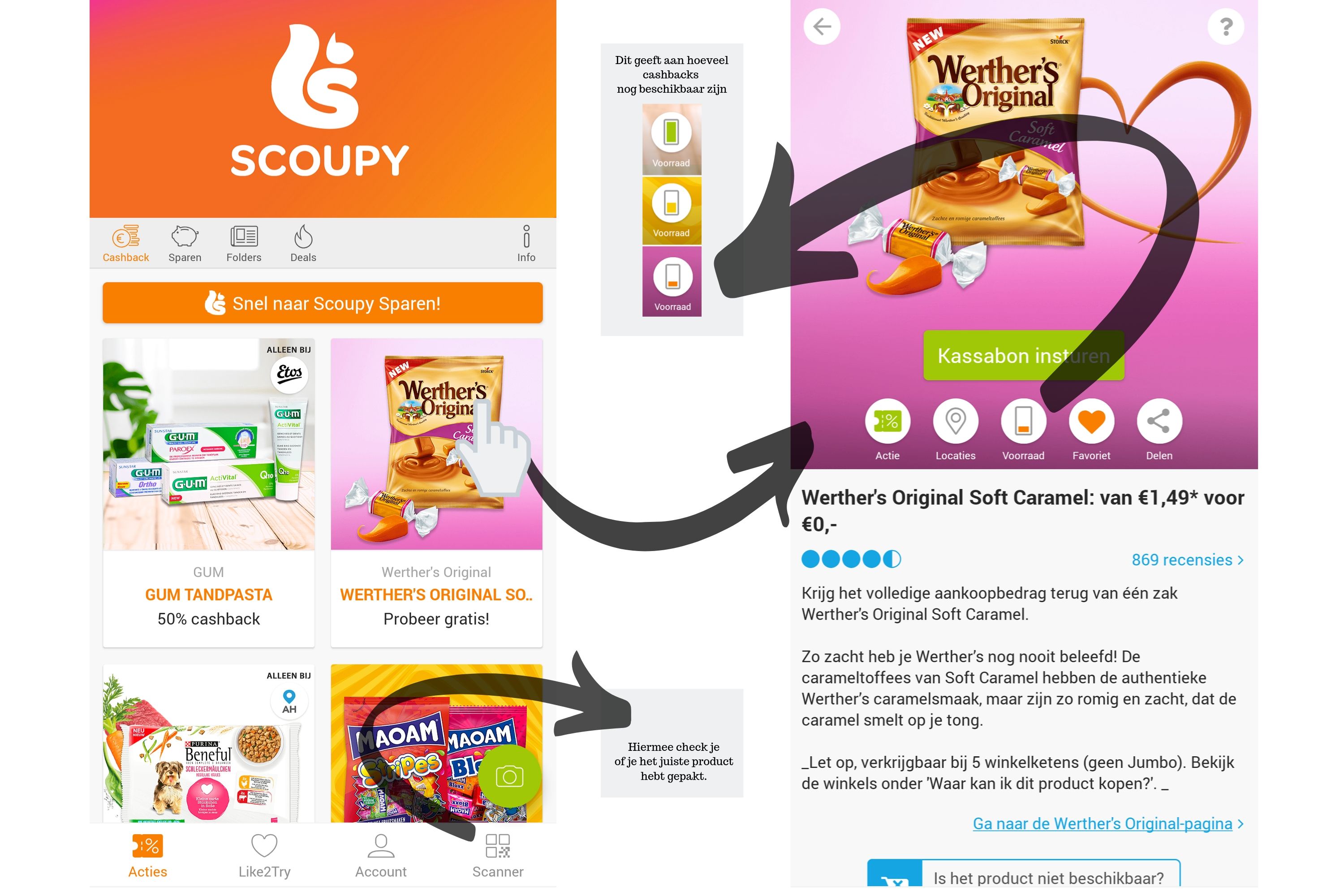 Cashback is het Engelse woord voor geld terug, je koopt een product en krijgt het aankoopbedrag (of een deel daarvan) teruggestort op je rekening. In geval van Scoupy moet je daarvoor de kassabon bewaren en indienen. Dit doe je door de gewenste actie te openen en op de knop ‘kassabon insturen’ te klikken, je kunt dan een foto maken van je kassabon. Daarna kies je welke winkel je de aankopen hebt gedaan en dan is het wachten op goedkeuring, die vaak binnen een aantal uur komt. Als je de aanbieding geopend hebt is ook te zien hoeveel cashbacks nog beschikbaar zijn, aangegeven met kleuren groen, oranje en rood. Als een cashback is verlopen kun je alleen nog een bon indienen van een product dat eerder gekocht is dan de uiterste bon datum, die duidelijk in de app wordt aangegeven.